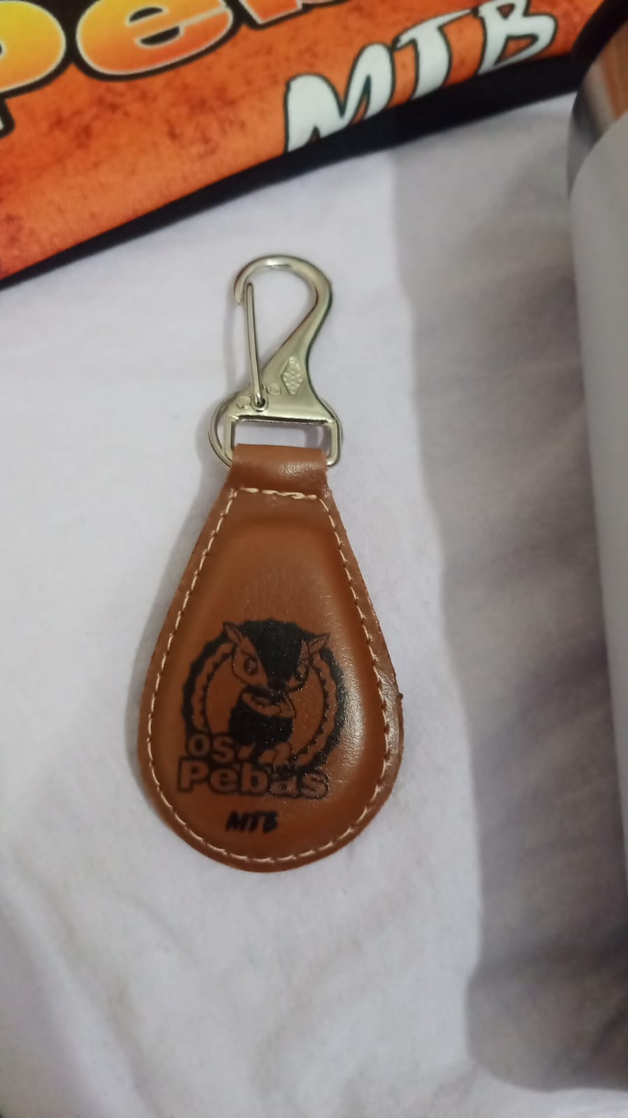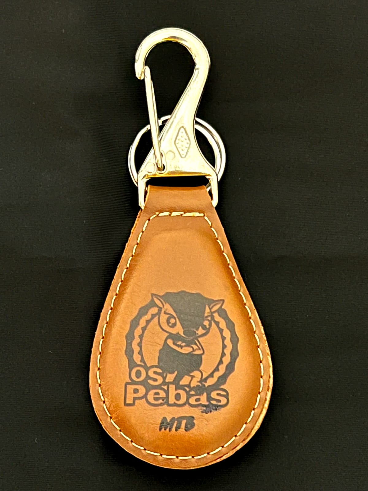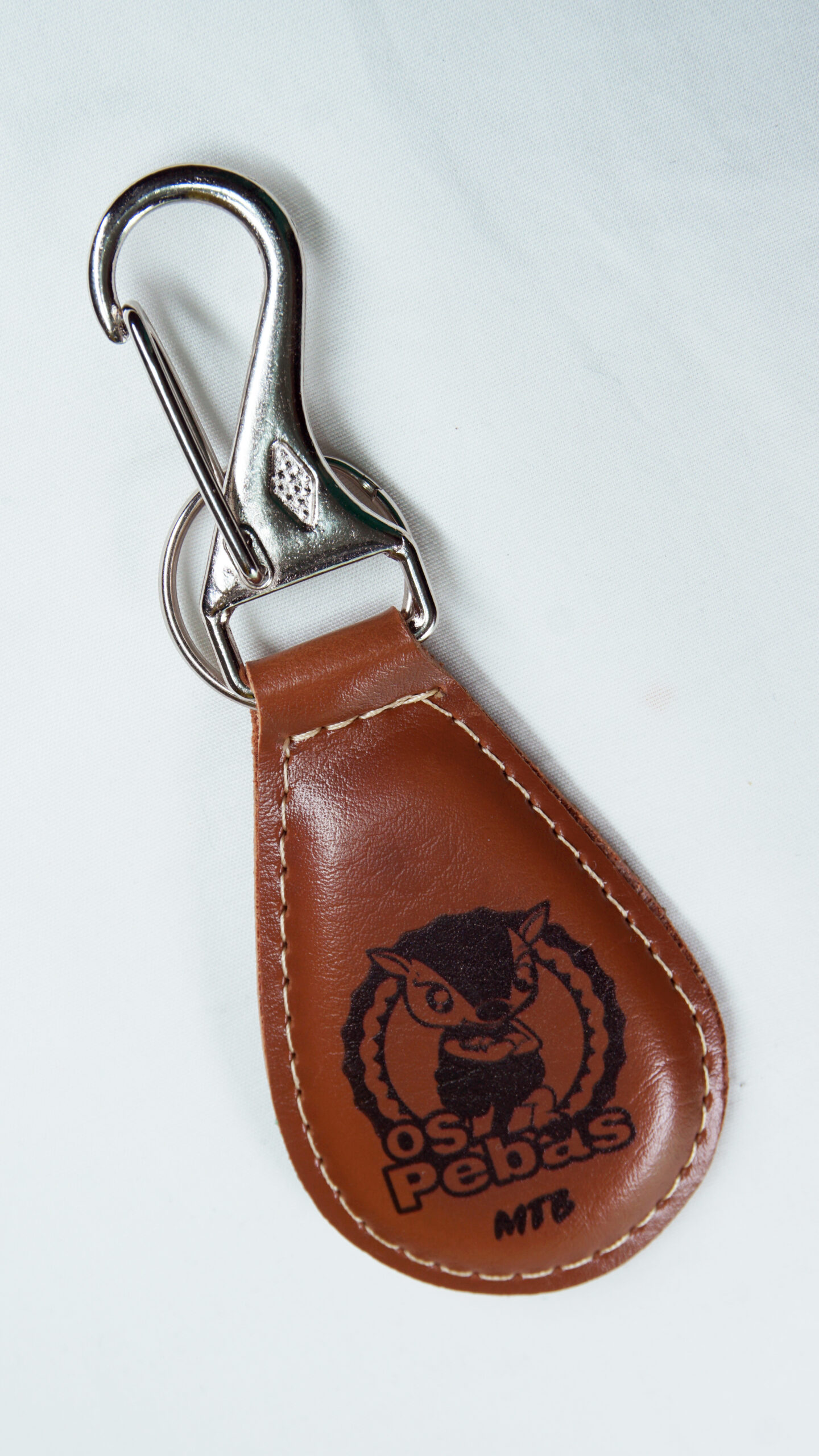 Chaveiro Os Pebas em couro sintético com baixo relevo, cor marrom.